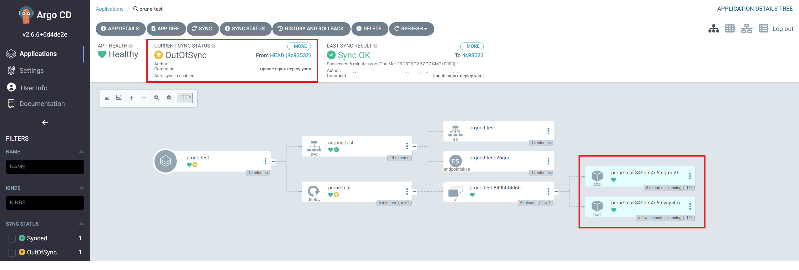 - yaml파일 수정 후 argoCD에서 다시 Sync를 맞추면 아래와 같이 기존 prune-test는 OutOfSync상태로 남게된다.