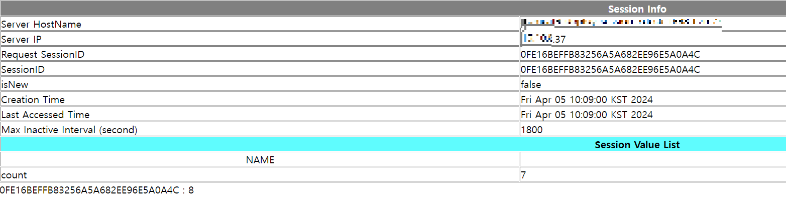 여러개 인스턴스를 띄워둔 뒤 RR방식으로 요청을 전달했을 때 session값이 유지되는 것을 확인할 수 있다.