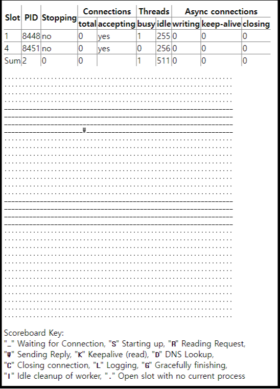 - mod_status : Apache의 상태(connection갯수, resource사용률, threads수 등)를 실시간으로 모니터링 할 수 있는 모듈